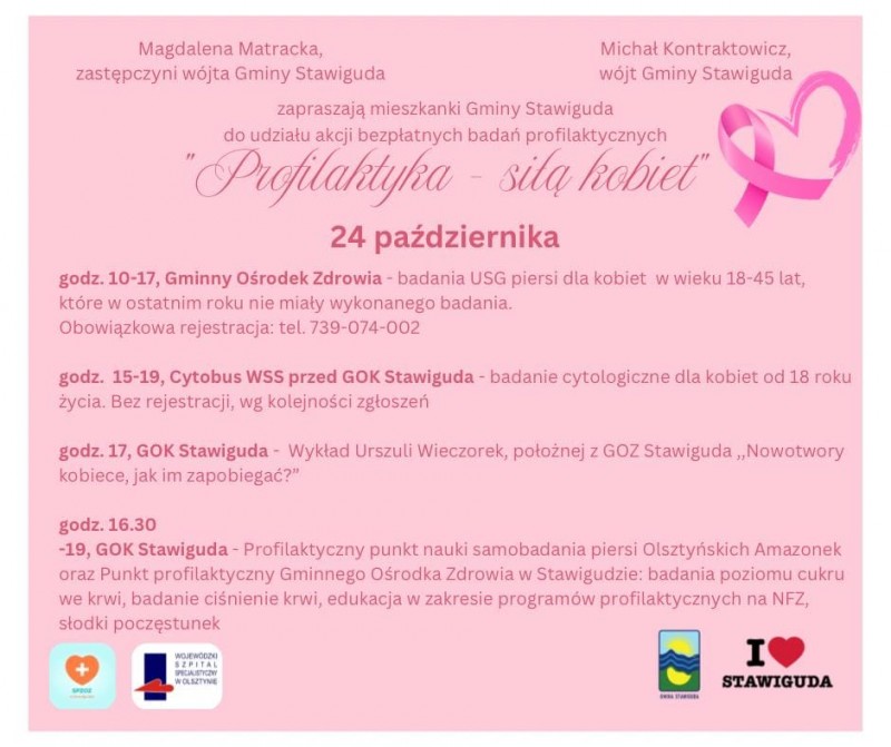 Michał Kontraktowicz – Wójt Gminy Stawiguda oraz Magdalena Matracka – Zastępczyni Wójta Gminy Stawiguda serdecznie zapraszają wszystkie mieszkanki Gminy Stawiguda do udziału w akcji bezpłatnych badań profilaktycznych, która odbędzie się już w najbliższy piątek.