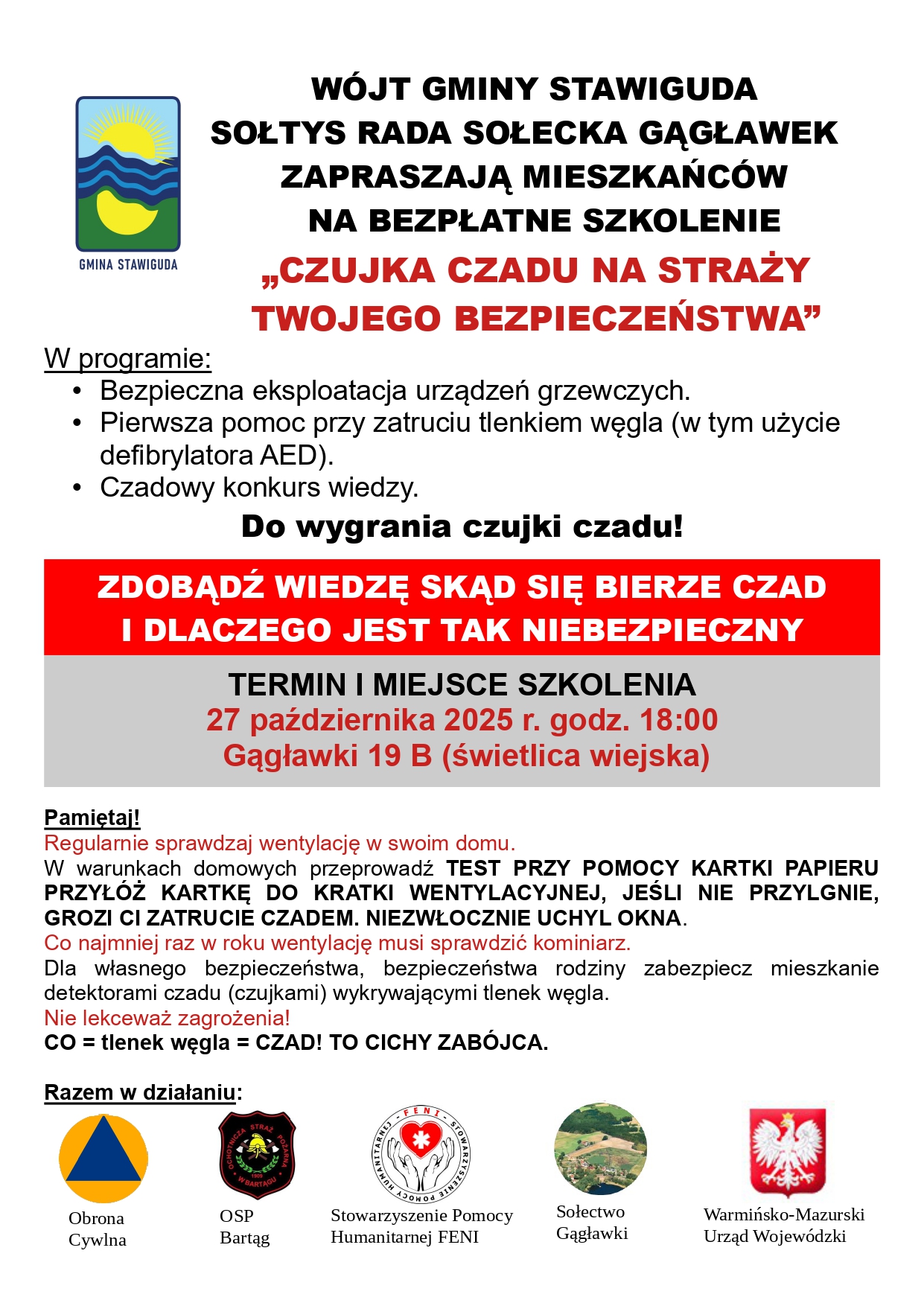 Urząd Gminy Stawiguda informuje, że w dniu 27 października 2025 r. (poniedziałek) o godz. 18:00 w świetlicy wiejskiej w Gągławkach odbędzie się 10 edycja szkolenia dla mieszkańców pn. „Czujka czadu na straży Twojego bezpieczeństwa”.