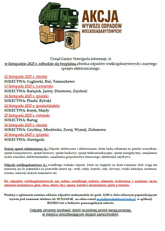 Urząd Gminy Stawiguda informuje, że w listopadzie 2025 r. odbędzie się bezpłatna zbiórka odpadów wielkogabarytowych i zużytego sprzętu elektronicznego. Informacja dotyczy wyłącznie zabudowy jednorodzinnej.