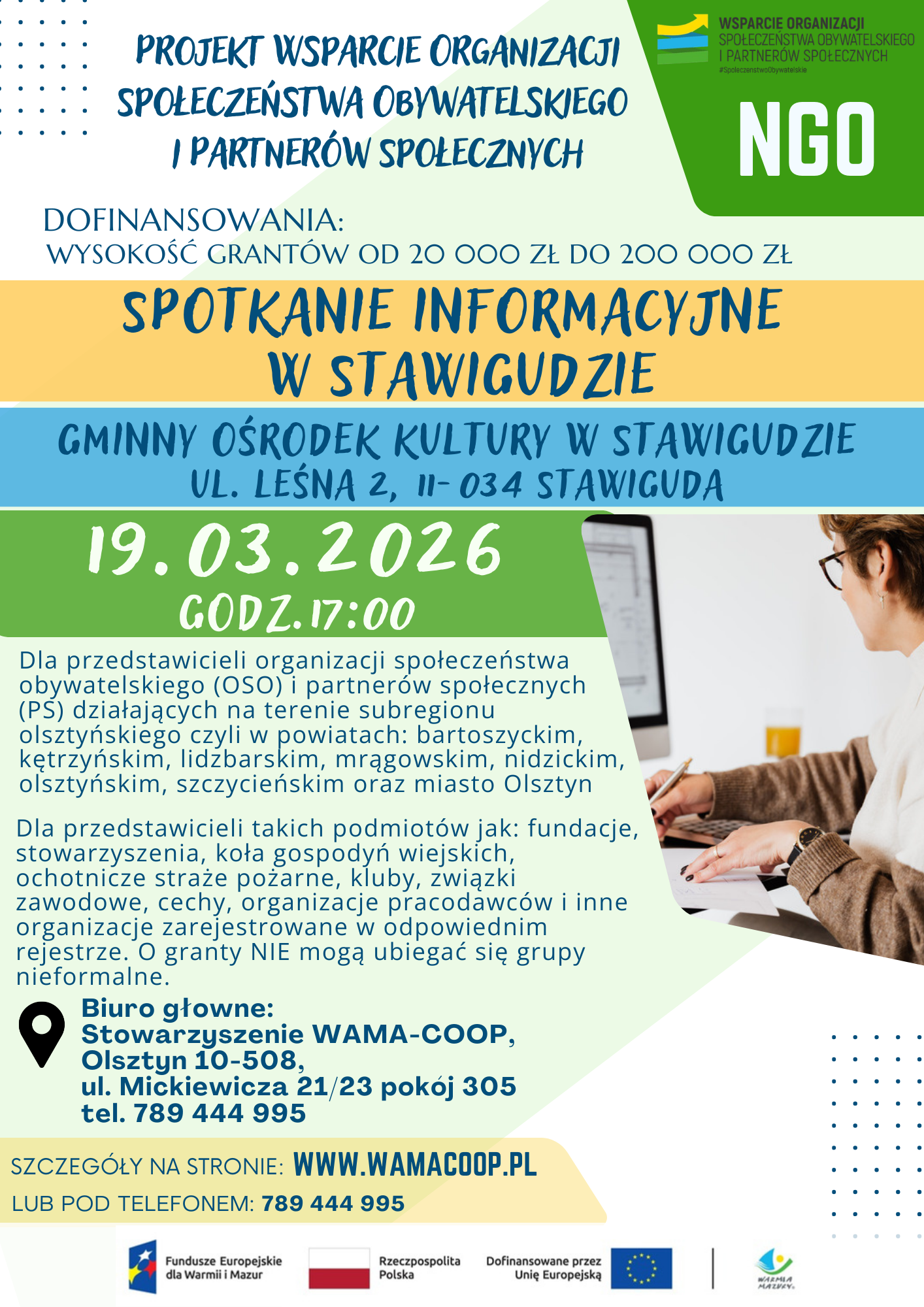Ośrodek Wsparcia serdecznie zaprasza przedstawicieli organizacji społeczeństwa obywatelskiego oraz partnerów społecznych na bezpłatne spotkanie informacyjne poświęcone projektowi „Wsparcie Organizacji Społeczeństwa Obywatelskiego i Partnerów Społecznych”.