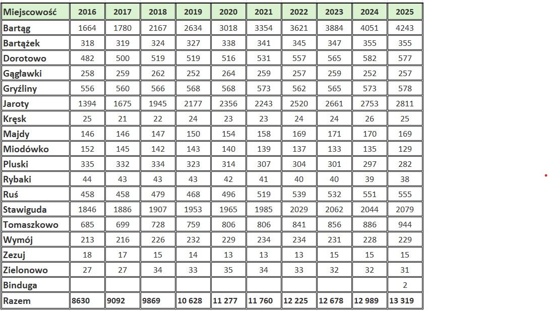 | Bartąg | 1664 | 1780 | 2167 | 2634 | 3018 | 3354 | 3621 | 3884 | 4051 | 4243 |