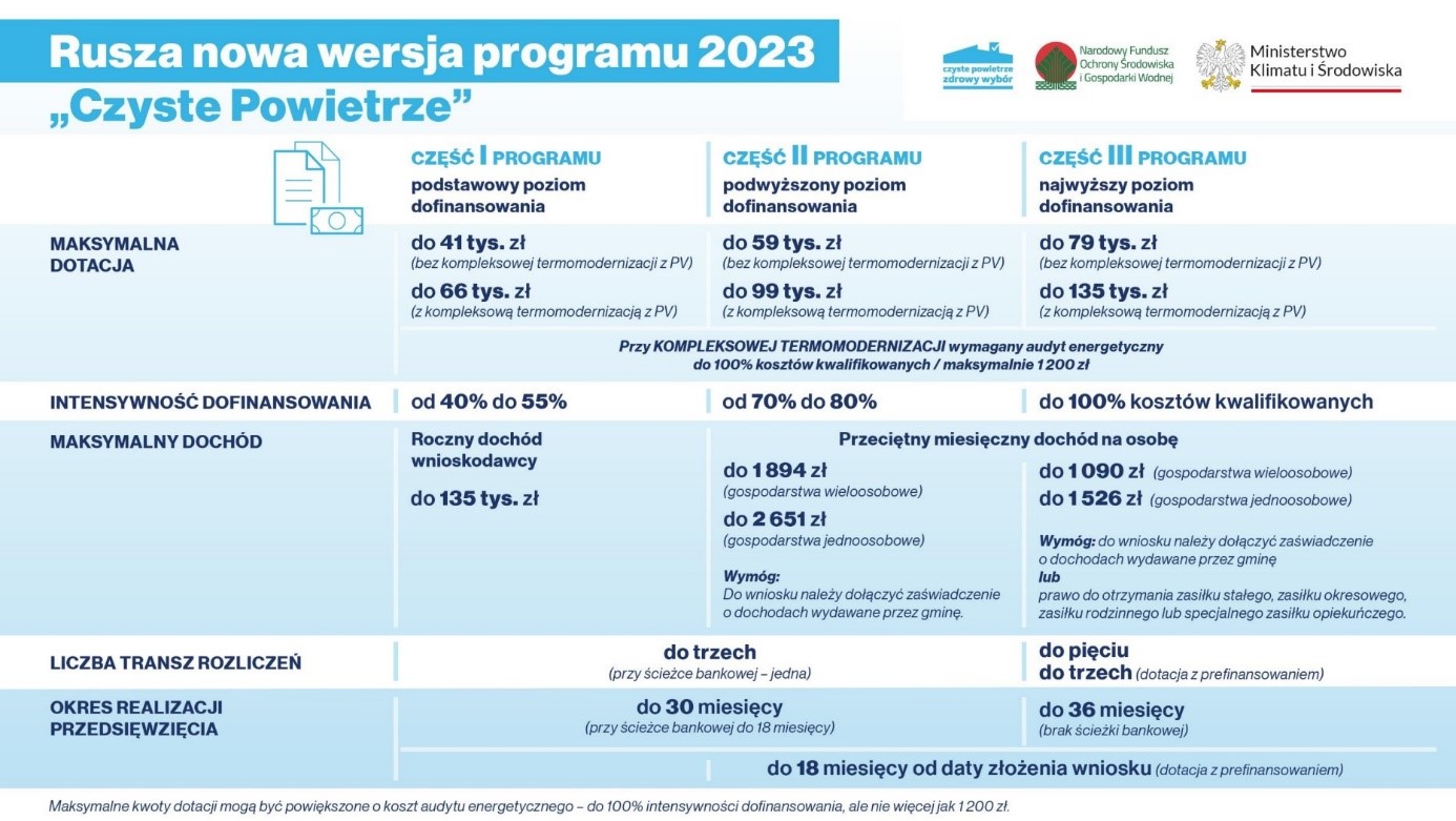 Właściciele lub współwłaściciele jednorodzinnych budynków mieszkalnych, lub wydzielonych w budynkach jednorodzinnych lokali mieszkalnych z wyodrębnioną księgą wieczystą, mogą skorzystać z dotacji w ramach Programu „Czyste Powietrze”. Dofinansowania dotyczą wymiany starych i nieefektywnych źródeł ciepła na paliwo stałe na nowoczesne źródła ciepła spełniające najwyższe normy, oraz przeprowadzenia niezbędnych prac termomodernizacyjnych budynku.