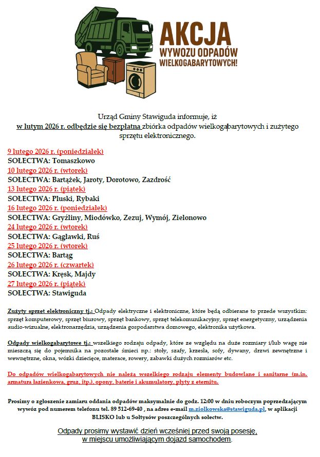 Urząd Gminy Stawiguda informuje, iż w lutym 2026 r. odbędzie się bezpłatna zbiórka odpadów wielkogabarytowych i zużytego sprzętu elektronicznego. Informacja dotyczy wyłącznie zabudowy jednorodzinnej.