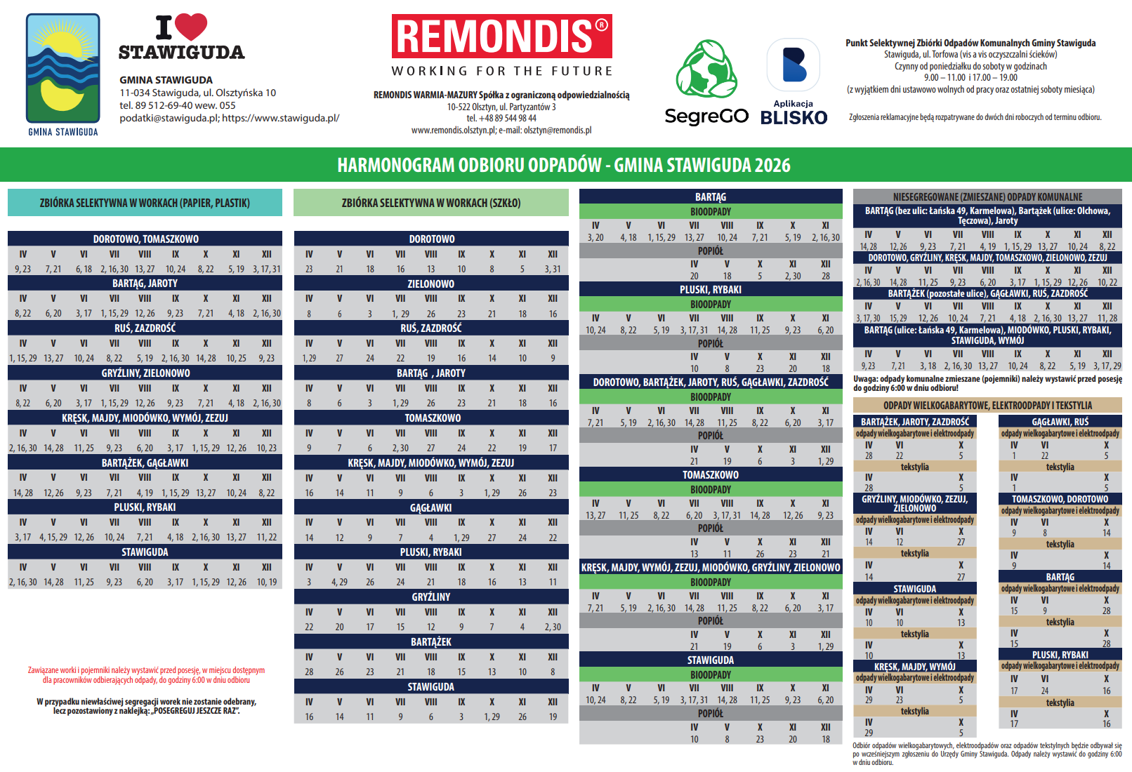 Informujemy, że odbiorem i transportem odpadów komunalnych od właścicieli nieruchomości zamieszkałych oraz nieruchomości wykorzystywanych na cele rekreacyjno-wypoczynkowe na terenie Gminy Stawiguda w okresie od 01.04.2026 r. do 31.12.2027 r. zajmuje się firma REMONDIS WARMIA-MAZURY Sp. z o.o. z siedzibą w Olsztynie (10-522) ul. Partyzantów 3.