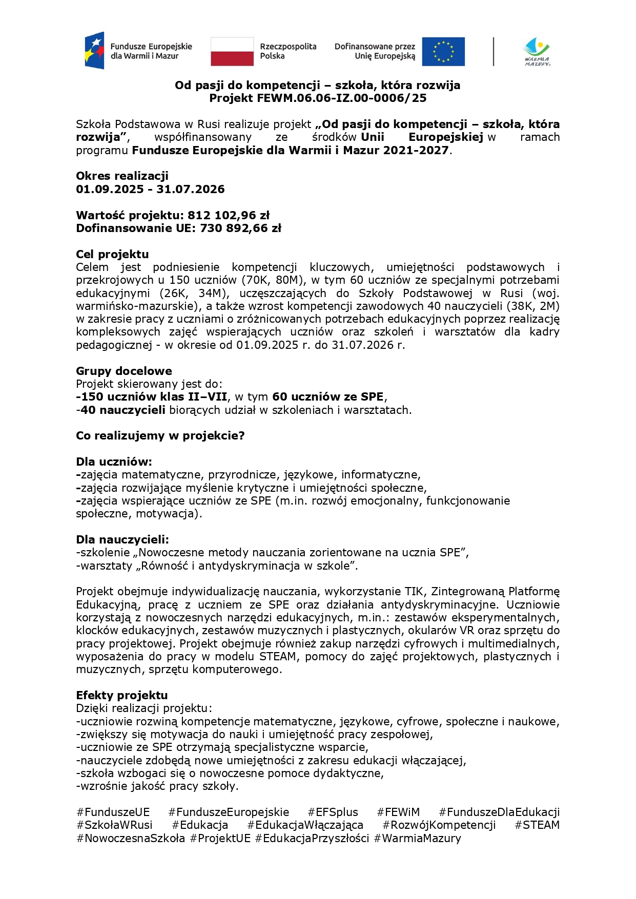 Od pasji do kompetencji – szkoła, która rozwija Projekt FEWM.06.06-IZ.00-0006/25
