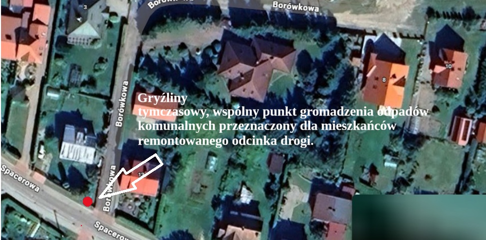 Z uwagi na brak możliwości odbioru odpadów bezpośrednio z terenu posesji, od wskazanej daty zostanie utworzony tymczasowy, wspólny punkt gromadzenia odpadów komunalnych, przeznaczony dla mieszkańców remontowanego odcinka drogi.